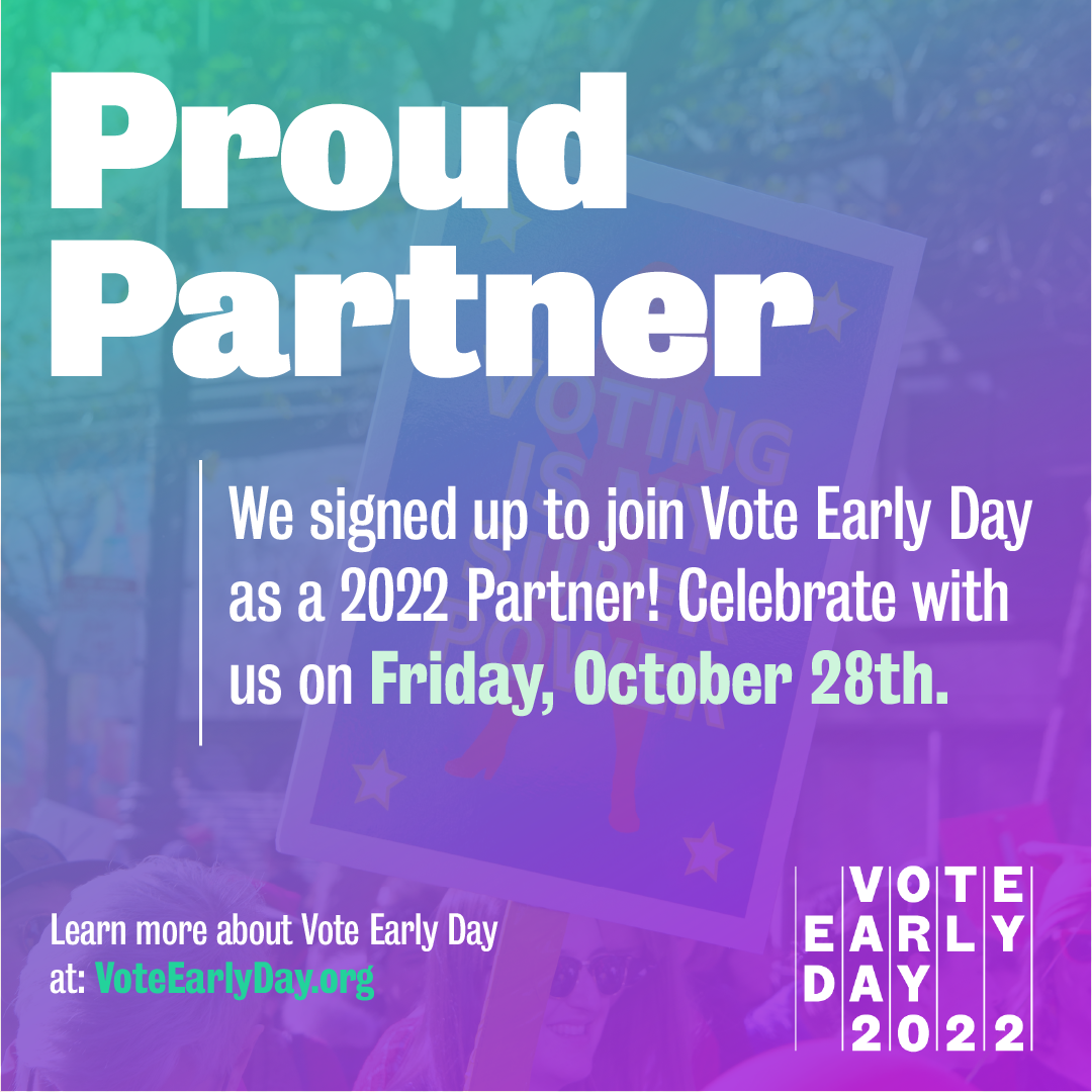 National Vote Early Day (Oct. 28, 2022) – Vote Early Day is a movement of nonprofits, businesses, election administrators, and creatives working to ensure all Americans know their options to vote early. Visit www.voteearlyday.org